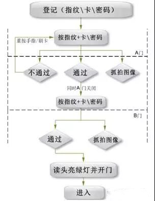 銀行AB二道門 開門人員到A門口,在讀卡器上打指紋或者刷卡,即可開啟A門,同時攝像機聯動抓拍,在人員將A門關閉后即可驗證通過B門。