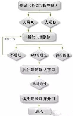 銀行金庫門為重點安全防范區域,需要多人監督驗證的情況下打開。為此需采用多人驗證開門(指靜脈、指紋等模式)如:人員A指靜脈+人員B指靜脈+后臺中心管理人員驗證,方可開啟金庫門,以防止不法分子用非法途徑獲得開門權限。