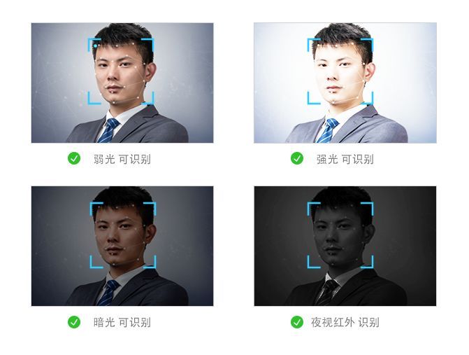 為了應(yīng)付復(fù)雜的環(huán)境,采用的人臉識(shí)別技術(shù)一定要支持強(qiáng)光、弱光、黑夜背光等多種復(fù)雜環(huán)境,并且可以檢測(cè)出正臉、側(cè)臉等多