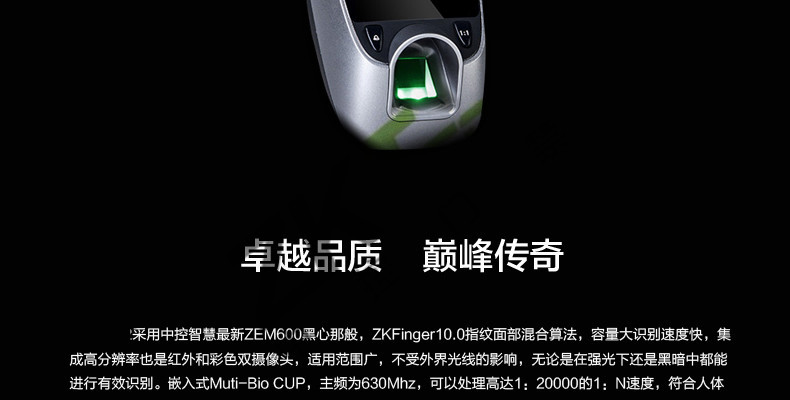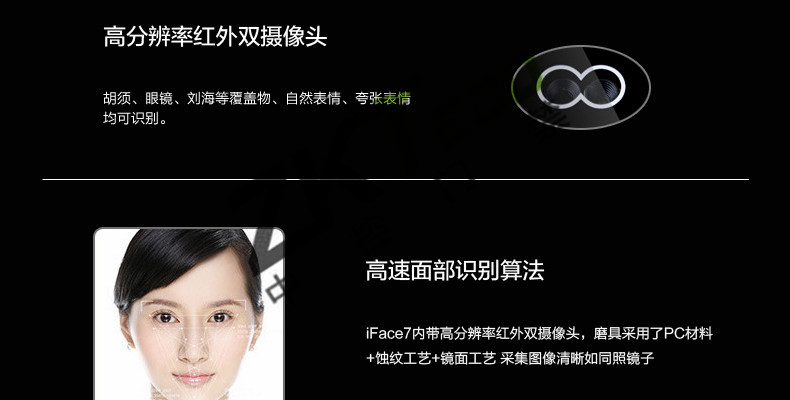 面部門禁一體機iFace7是基于ZEM800多媒體開發平臺設計的一款集指紋和面部混合驗證的3寸觸摸彩屏門禁終端,采用ZKFinger VX10.0最新指紋算法及ZKFace VX7.0面部算法,識別速度快,靈活選擇面部、指紋或者密碼開門方式,集成高分辨率夜市紅外和雙攝像頭功能,適應范圍廣。支持高級門禁功能(不同時間段開門,多人開門,拆機報警,門未關好報警,門被非法打開報警,開門按鈕輸入,有限門鈴接口,脅迫報警等)。標配的TCP/IP通訊,支持跨網段跨網關連接,是安防工程的首先產品,可用于銀行、部隊、機場等高安全場所。