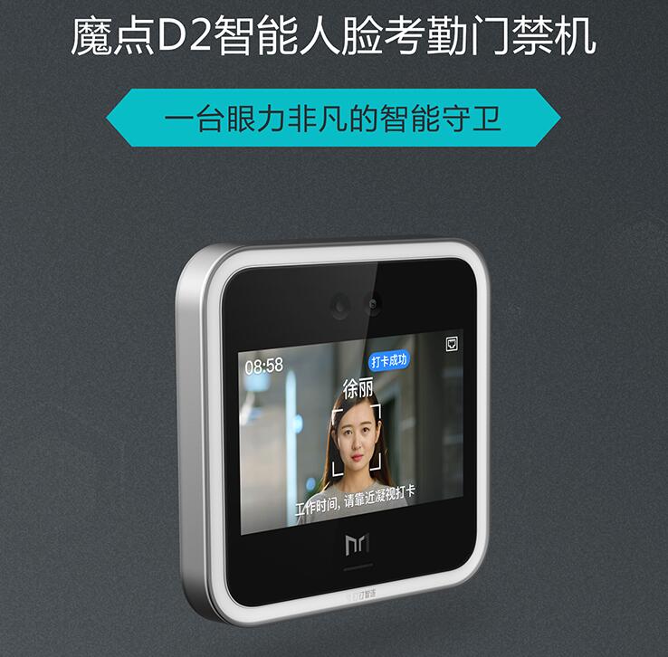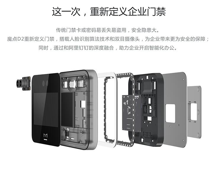 魔點D2門禁機介紹: 魔點D2門禁機造型簡單,體積小巧,尺寸為150*150*17.8mm,整機重量為355.5g,搭載了兩個3*3微米、1/2.7英寸傳感器的大攝像頭和一塊5吋的屏幕,結合獨家的人臉識別算法技術,不但可以多角度準確進行人臉識別,還可以顯示刷臉開門打卡是所需的必要信息。